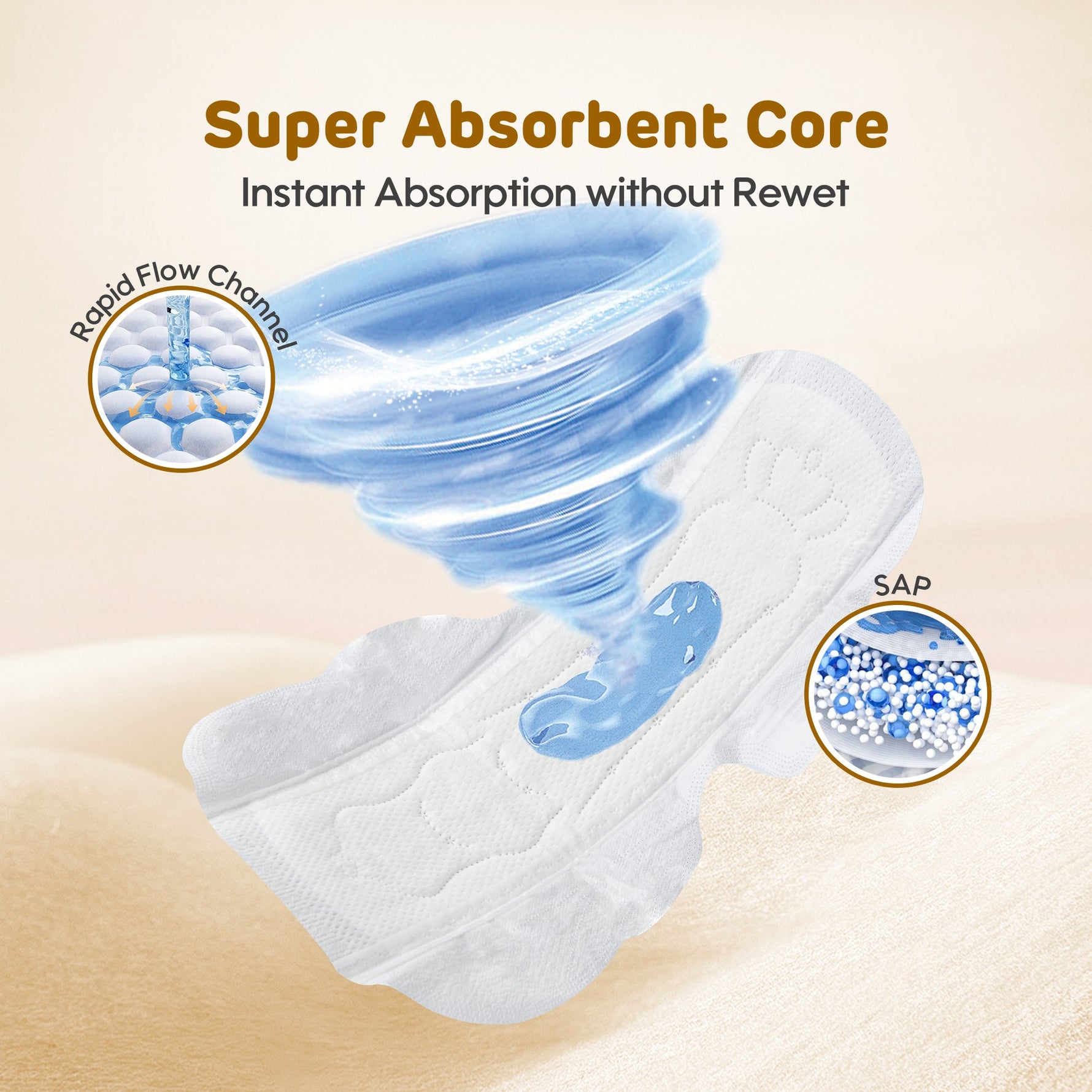For Comfy Ultra Soft Sanitary Napkin: With a unique soft 2-layer design on the surface for the ultimate comfortable period experience.The Super Absorbent Core draws moisture away for faster absorption. Each pad has grooves that channel moisture into the center of the pad for effective leakproof.The aluminized packaging with a reusable seal makes the package able to stick back after first opening, which is convenient for storing the remaining sanitary napkins.