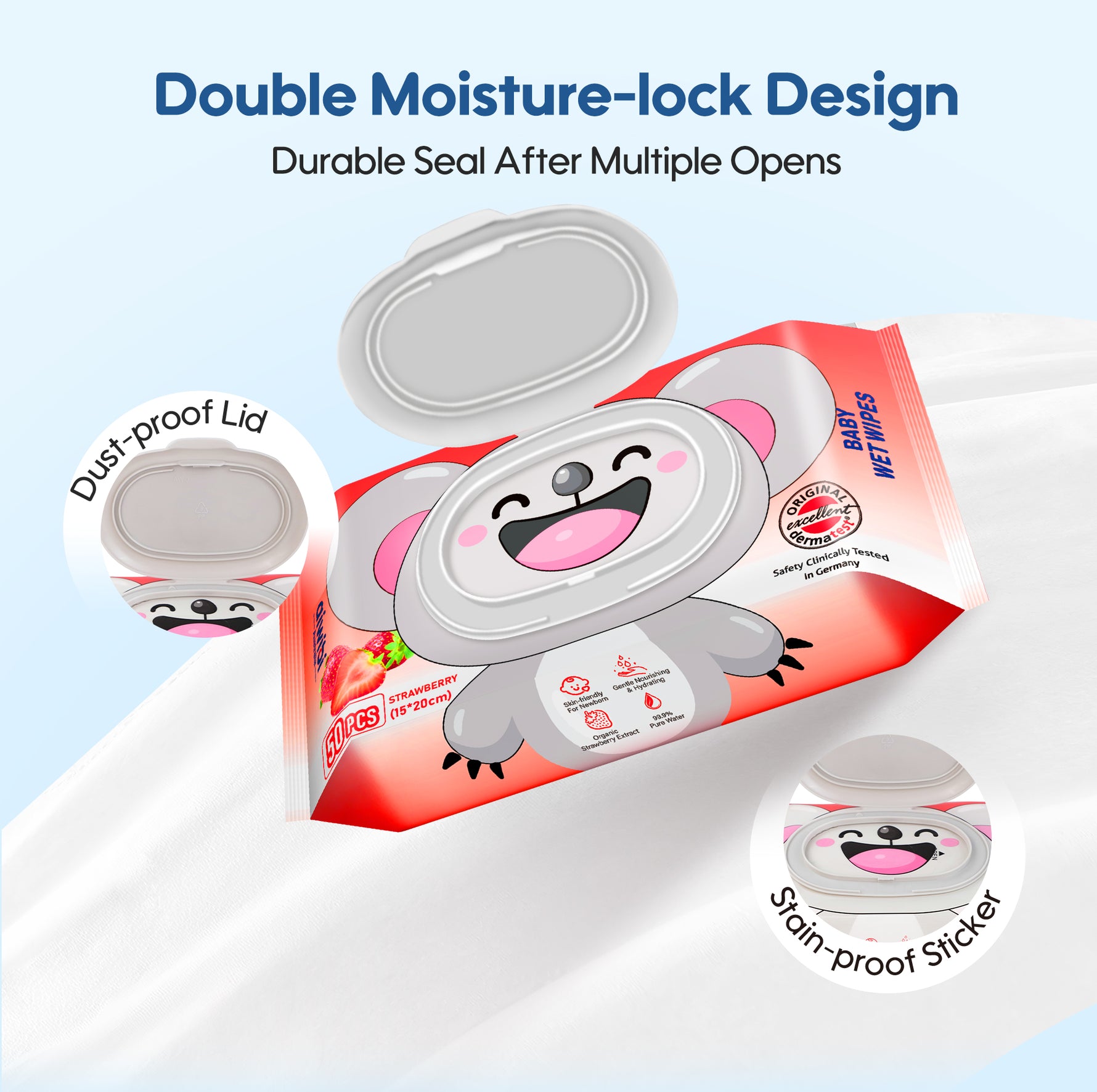 Our wet wipes, in strawberry, lemon, and lavender scents, are hypoallergenic and free from harmful chemicals. They are larger and thicker with aloe vera extract for gentle care, and feature dual embossing for long-lasting hydration.