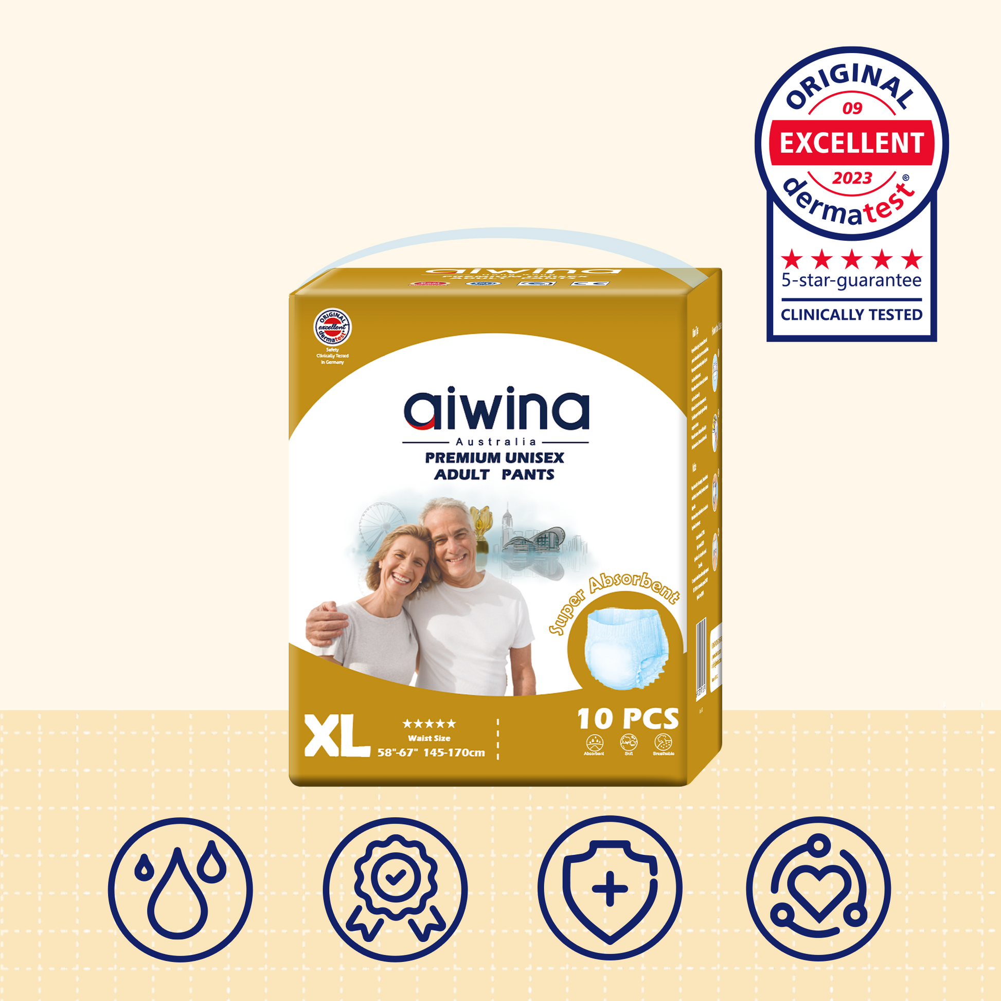 Aiwina diapers have been clinically tested and awarded an "Excellent" rating by the German Dermatest institution, which means that our products have reached the world's top level of safety and quality certification. We hope to bring more respect, convenience, and comfort to the adult population in need of special care through high-quality products.